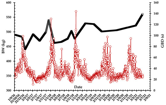 1]. Daily remote monitoring of the herd’s energy balance (EB) components and of the grazing land’s forage quality and availability—calculated from the grazing behavior of the cattle and using grazing bout duration (GBD) as an index for biomass availability [