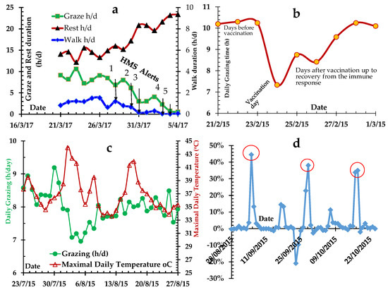 Figure 9d presents three consecutive heat-detection (estrus) events.