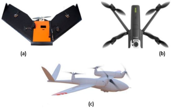 (a) Fixed-wing Unmanned Aerial Vehicles (UAV) (Tuffwing Mapper) [14]; (b) rotary-wing UAV (quad-rotor Parrot Anaf) [15]; (c) VTOL UAV (Tron) [16].