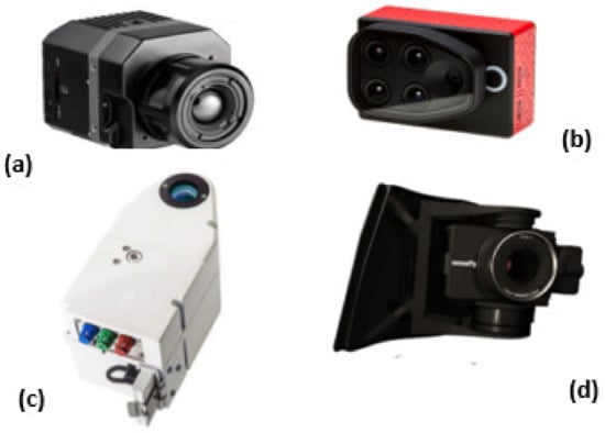 (a) Thermal camera (Flir vue pro) [19]; (b) multispactral camera (Parrot sequoia) [20]; (c) heperspctral camera (Rikola hyperspectral imager) [21]; (d) RGB camera (Sensfly S.O.D.A) [20].