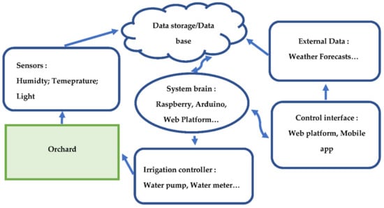 Analyzing the different examples cited in Table 4, generally, the architecture of irrigation systems based on IoT technology takes the structure detailed in Figure 3.
