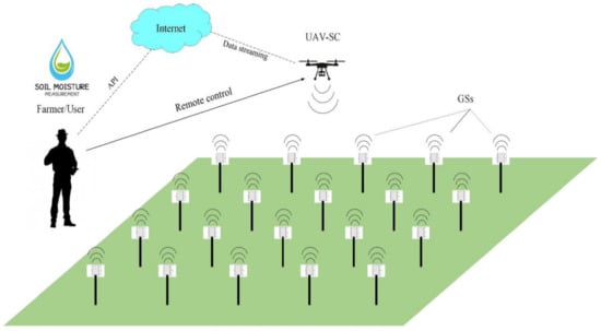 Tasks with direct communication with the system include real-time communication between UAV and sensors, which is now available with the development of federated wireless smart sensors (WSN) which communicate with the UAV. The use of UAVs with intelligent ground-based WSNs is proven to be a robust and efficient solution for data collection, monitoring, and analysis. The advantage lies in online data collection and relaying to a central monitoring point, while effectively managing the network load and latency through optimized UAV trajectories [58]. The GS-UAV-SC (GS for ‘Ground Sensors’, and UAV-SC for ‘Unmanned aerial vehicle small cells’) model, proposed by Duangsuwane et al. 2020 [9], represents a perfect example. The GS-UAV-SC (Figure 4) is a soil moisture-monitoring sensor, which is connected to the UAV to stream data over the Internet in order for the data to be stored and calculated on the cloud platform. The farmer/user can further control the UAV in its movements around the field to collect all of the data from each sensor.