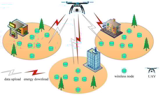 On the other hand, a UAV can function as an energy controller. Especially with the fact that most wireless sensors in the IoT environment are facing the limited energy problem, the way in which to provide sustainable energy to these sensors has become a challenge. In this context, Liu et al. 2019 [59] presented a UAV to swap energy among wireless sensors by adapting the optimal resource allocation approach based on dynamic game theory (Figure 5).