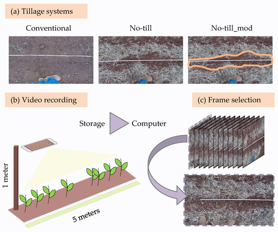 (a) Tillage systems used to create our dataset; (b) video recording technique and (c) manual frame selection.