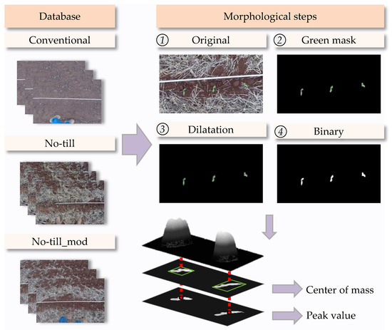 To capture early crop growth dynamics, data was collected in two periods: 7 and 12 days after planting (DAP). We assessed a crop row in both tillage systems to count each plant and measure the intra-row spacing across five meters. To facilitate image acquisition, we recorded a video using a mobile camera with resolutions of 13 MP, 1080 P, and 30 FPS (Figure 1b). To ensure an adequate pixel spatial resolution and minimal distortions [15], a height of one meter and a perpendicular angle (90°) were considered as the reference. We used a level indicator from the mobile device to maintain its stability and a standardized object beside the crop row. To avoid differences over day lighting, we recorded every video at the same hour: about 04:00 pm in clear sky. No-till rows were recorded twice: with an original aspect and after cleaning excessive organic material, weeds or plants remain from the harvesting, which may affect the image processing [22]. We partitioned the dataset (Figure 1a) into conventional (Conv_), no-till (Notill_), and no-till after cleaning (Notill_mod). The images were extracted from each video (Figure 1c). We selected images based on perpendicularity, blurring, and motion.
