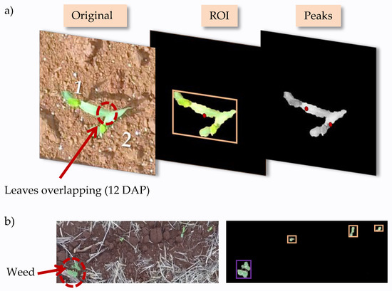 Illustrative example of (a) misdetection due to leaves overlapping and (b) intra-row weeds.
