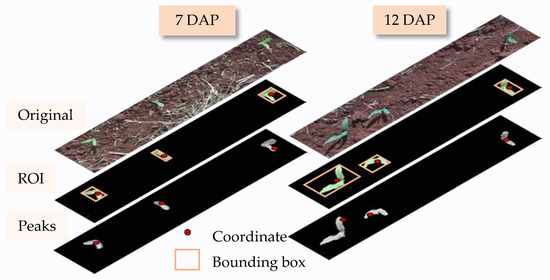 In both methods, precision and recall were above 0.88. Recall was lower in 12 DAP and using the ROI method, as the closest intra-row spacing supports the leaves overlapping and merges the two bounding boxes (Figure 3a). This problem occurs mostly as the plant grows, since its vegetative structure will grow with more and larger leaves. It did not occur in the Peaks methods. However, the detection can be also compromised if this spacing is very close since it will not be possible to distinguish the prominence value. The overall R² was 0.90, but for 12 DAP, Notill_mod_ROI was 0.71. The RMSE for the spacing values was also highest in 12 DAP with ~5.63 cm (Table 1), as the coordinate point was not exactly in the plant center due to larger leaves increasing the bounding boxes’ size, thus changing the center of mass (Figure 3a).