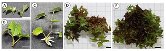Growth and propagation in vitro of grapevine Vitis vinifera cv. Traminer Pink under different conditions. All media were smented with 2 mg/L 6-BAP. (A), initial explant—apical point with two young leaves (scale bar = 2 mm). (B), plant regeneration after two weeks growing on solid medium smented with 2 mg/L 6-BAP (scale bar = 2 mm). (C), rooting of regenerants after four weeks culture on solid medium smented with 0.5 mg/L IBA (scale bar = 5 mm). (D), a cluster of new shoots after six weeks of cultivation in TIB-1 (scale bar = 5 mm). (E), a cluster of new shoots after six weeks of cultivation in TIB-2 (scale bar = 5 mm).