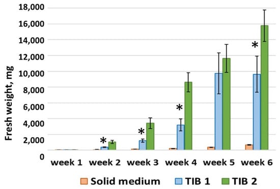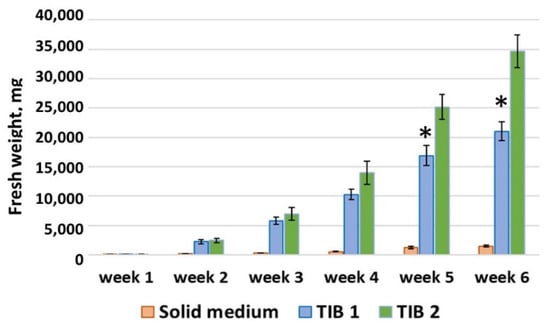 A six-week cycle of propagation in TIB-2 resulted in an almost 300-fold increase in fresh mass, from 60 to 35,000 mg (Figure 4). TIB-1 propagation was slower but still very efficient. After a six-week cycle, massive shoot proliferation was observed in plants in both TIB-1 and TIB-2; 12 plants produced 63.7 ± 14.2 and 244.0 ± 24.3, respectively.