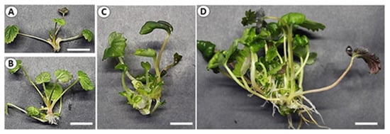 Growth and propagation in vitro of strawberry (Fragaria × ananassa cv. Murano). (A), plant regeneration after 2 weeks growing on solid medium smented with 2 mg/L 6-BAP and 0.2 mg/L IBA (scale bar = 10 mm). (B), rooting of regenerants after four weeks culture on solid medium smented with 0.5 mg/L IBA (scale bar = 10 mm). (C), a cluster of new shoots after five weeks of cultivation in TIB-1 (scale bar = 10 mm). (D), a cluster of rooted shoots after six weeks of cultivation in TIB-2; medium smented with 1 mg/L IBA (scale bar = 10 mm).