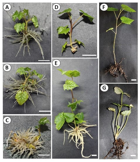 Rooting and hardening of grapevine cv. Traminer Pink and strawberry cv. Murano cultivated in vitro. Scale bar = 1 cm. (A), grapes: rooting after two weeks of cultivation in TIB with 1 mg/L IBA. (B), grapes: rooting after two weeks of cultivation in TIB with 1 mg/L IBA. (C), grapes: rooting after four weeks of cultivation in TIB with 1 mg/L IBA. (D), grapes: rooting after one-week cultivation in TIB with 0.5 mg/L IBA. (E), grapes: rooting after four weeks culture on solid medium with 1 mg/L IBA. (F), grape plantlet after hardening for four weeks replanted in a greenhouse. (G), bare-rooted strawberry plant after hardening for four weeks and acclimation in a greenhouse.