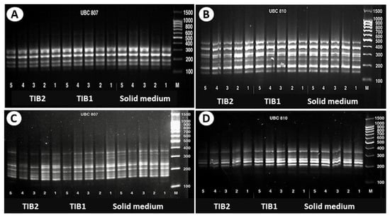 Representative image of ISSR analysis of regenerants of grapevine cv. Traminer Pink (A,B) and strawberry cv. Murano (C,D) cultivated in vitro. In each of the three propagation treatments, the propagated plantlets are identical. Five plants (1–5) are presented for each treatment. TIB-1, temporary immersion bioreactors; TIB-2, temporary immersion bioreactors with automatically prepared media. M—marker, 100 bp DNA Ladder.