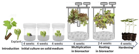 In this research, two techniques were combined: in vitro cultivation was initiated on solid media and then advanced to rapid propagation and rooting in bioreactors (Figure 7). The full cycle took ca. six months, similar to the results of Mhatre et al. [] on solid media, but with a higher propagation rate and mass accumulation. Thus, a six-week cycle of propagation in TIBs resulted in an increase of fresh mass of up to 300-fold, with a propagation rate of ~5 for grapes and ~20 for strawberries (Figure 2 and Figure 4). Our studies also confirm previous reports on successful regeneration of berry crops on semisolid medium, followed by culturing in a bioreactor system []. Similarly, in carnation, TIB culture resulted in more than ten times shoot production []. This is probably due to better contact of the plant with the culture medium, optimal nutrient and growth regulator supply, and aeration and medium circulation [].