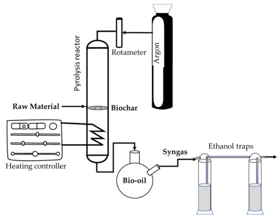 The heating ramp was programmed using a CN300-P temperature regulator (Conatec, Irún, Spain), connected to the oven through a thermocouple. A heating wire was placed around the bottom of the quartz tube (supported by aluminum foil) to prevent condensation of the liquid in the tube, which was intended to occur in the round bottom flask (Figure 1). Two ethanol traps were used to remove pollutants from syngas. A rotameter was used to control the flow rate of the inert gas (Ar) through the pyrolysis reactor.
