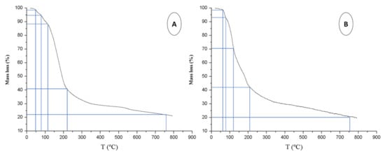 In summary, the greatest weight loss occurred up to 400 °C (Figure 2A,B), which indicates that the samples are mainly made up of water, cellulose, and hemicellulose, while 72–78% degradation of the initial mass was achieved at 600 °C, which coincides with what is reported in the literature [38].