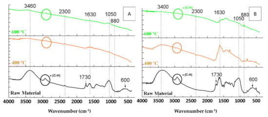 Furthermore, with respect to OP biochars (Figure 3B), the bands related to water (3400 and 1630 cm−1) at 400 °C had a smaller decrease in intensity, while at 600 °C, they completely disappeared. In addition to water, the band in the C-H vibrations region (2900 cm−1) [24] was more intense for the lowest pyrolysis temperature, which could indicate that a hydrocarbon skeleton may be formed at this temperature. The band at 2300 cm−1 (CO2) remained almost constant. Finally, for both OP and OW biochars, the band attributed to C=O bonds (for example of lactones) at 1730 cm−1 disappeared completely after pyrolysis, as did the band that corresponds to calcium compounds (600 cm−1), due to their decomposition with increasing temperature [34]. Finally, the intensity of the band at 880 cm−1, corresponding to aromatic compounds [35], increased with increasing temperature.