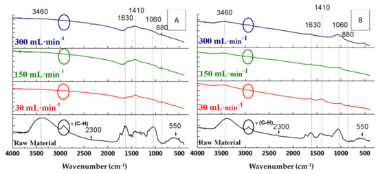 Regarding orange waste, the water bands (3460 and 1630 cm−1) of the resulting biochars had the same intensity under the three assayed conditions (Figure 4A). It was remarkable that the bands in the region of the C-H vibrations (at 2900 cm−1) [24] were only found at higher flow rates, whereas the band at 2300 cm−1 (CO2) did not depend on the flow rate. The intensity of the band at 1410 cm−1 (carboxylic acid band) [42] was inversely proportional to the flow rate. Therefore, the highest intensity was observed in the experience carried out under 30 mL Ar·min−1 flow rate (Figure 4A). In contrast, of note is that the intensity of the 1060 cm−1 band (C-O bond) was directly proportional to the flow rate, corresponding to the band that appeared with the highest intensity in the biochar pyrolysed under 300 mL Ar·min−1. The band at 880 cm−1, corresponding to aromatic compounds [37], did not appear in the OW biochars. Finally, the band related to calcium was observed at 550 cm−1 [43], which only appeared in OW biochars when working under 300 mL Ar·min−1.