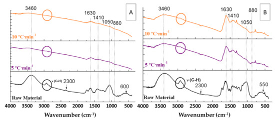 IR spectra of the raw materials and the biochars resulting from the pyrolyses of orange waste (A) and orange pruning (B) performed at 400 °C for 2 h under 150 mL Ar·min−1 flow rate using different heating ramps.
