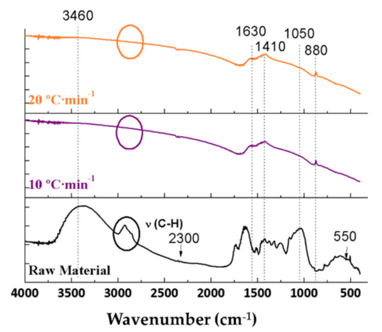 FTIR spectra of the raw material and the biochars resulting from the pyrolyses of orange pruning performed at 600 °C for 2 h under 150 mL Ar·min−1 flow rate using different heating ramps.
