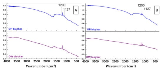 Regarding the OW biochars, it was observed that thermal treatment led to a decrease in the intensity of the FTIR bands present in the raw material. Bands associated with the presence of water adsorbed on the surface (a wide band around 3400 cm−1 and a band at 1630 cm−1) decreased considerably in OW biochars (Figure 3A). These bands shifted slightly towards higher wavenumbers after pyrolysis. For example, the water band observed at 3380 cm−1 for OW could be found at 3640 cm−1 in its biochars (indicated by an arrow in Figure 3A).