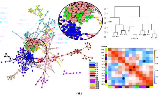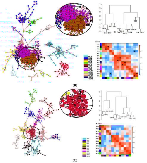 Networks of (A) the conventional cropping system (Conv) and both organic cropping systems, (B) Org_C and (C) Org_M, based on OTU profiles. On the top right a hierarchical clustering is shown based on Pearson correlations among module eigengenes. Below the clustering, a heatmap shows the coefficient values. The color red means higher correlation, while blue signifies lower correlation. Modules smaller than five nodes were excluded from eigengene analysis and are not displayed. Modules larger than five nodes are labelled with different colors in the network. The size of the circle is directly proportional to the number of edges in the module, and a large circle implies a higher number of connections in the node. Red and black lines represent negative and positive edges, respectively. A black star on the heatmap (