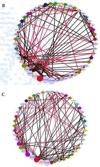 Global networking showed that the cropping system with organic matter had more negative interactions among nodes. Negative interactions could suggest competition, exclusion or even preference for different niches [52,53]. However, according to Coyte et al. [54], negative interactions lead to network stabilization since they compensate for the overexpression of some members, which could lead to destabilization of the network. On the other hand, the eight most abundant OTUs, which showed inverse connections within the global network, also had a greater number of positive connections than within the conventional cropping system. A greater number of positive connections implies cooperativity or codependence among the nodes [54]; more concretely, positive correlations among species mean that these species’ coexistence is based on more than chance (e.g., mutualism, predation, etc.). Therefore, our network analysis revealed that an organic-system microorganism habitat with more specialized niches gives stability to the microbial community and resistance to external factors, with cooperation amongst the most-abundant OTUs promoting the development of the other microorganisms. However, the Conv system showed a higher number of positive connections on its global network, which could indicate a lack of negative regulators, thus being prone to imbalance through external factors.