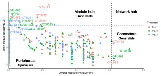Zi-Pi plot showing the distribution of OTUs according to their topological roles. Each color represents the different cropping system nodes from the networks: Conv, conventional cropping system; Org_C, organic cropping system with compost and compost tea; Org_M, organic cropping system with manure; OTU065, OTU524, OTU161, OTU153, OTU108, OTU085, Actinobacteria; OTU239, Chloroflexi; OTU483, OTU537, OTU512, OTU422, OTU599, OTU442, OTU508, OTU461, Proteobacteria; OTU630, Verrucomicrobia; OTU271, Firmicutes; OTU339, NKB19, OTU345, Planctomycetes.