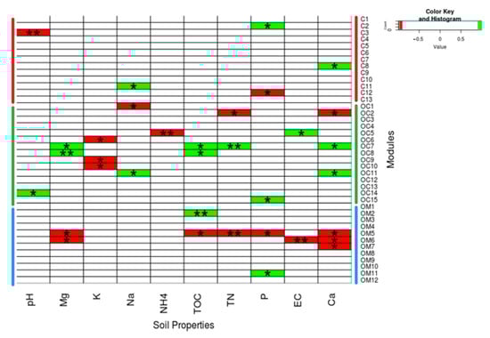 Heat map showing significant module correlation between soil properties and the modules in the Org_C, Org_M and Conv cropping systems. Colors represent positive (green) or negative (red) correlations, and the star symbol (*) in the cells represents the significance of that correlation, with *, p < 0.05; **, p < 0.01. Conv, conventional cropping system; Org_C, organic cropping system with compost and compost tea; Org_M, organic cropping system with manure; TN, total nitrogen; TOC, total organic carbon; Mg, K, P, Na and Ca; available Mg, K, P, Na and Ca, respectively; EC, electrical conductivity.