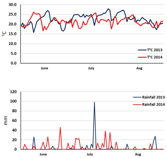 In Figure 2, the meteorological data observed during the period of the study are reported. All the weather data were collected from the meteorological station located 150 m far from the lysimeters. The meteorological station is part of the regional weather network system. In 2013 two periods of high temperatures were recorded, during the days that preceded the spraying and in the last ten days of July (which corresponded to the end of the trial). In 2014, the average temperature was lower than in the previous year (more than 1 °C). During 2013, the good weather conditions during the weeks after herbicide application did not require the covering of lysimeters for rainfall events. In the night between 30 and 31 July 2013, just before the irrigation at 28 DAT (Days After Treatment) and 14 + 14 DAT, a sudden storm discharged 24 mm of rain on the uncovered lysimeters. The irrigation planned that day has considered the rainfall fallen during the night, and thus the amount of water distributed was 130 L. In 2014, we recorded two heatwaves, the former just in the days following herbicide application, the latter in the middle of July. Both periods, of about 7 days each, were characterized by max and min mean temperatures significantly higher than the average. For instance, during the first heatwave from 7 June to 13 the maximum average temperature was 33.5 °C and the minimum 16.5 °C, compared to the average temperature of the period June–July of 28.7 °C and 15 °C, respectively. These periods of high daily temperatures likely amplified the evaporation processes, influencing the total amount of water available for percolation.