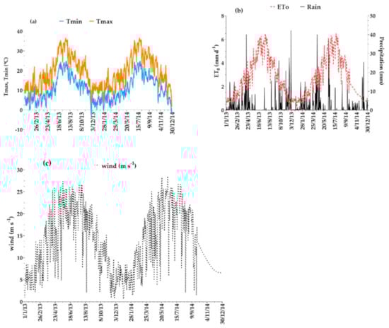 Daily acquired climatic variables at the weather station located in the experimental site in 2013 and 2014: (a) maximum (Tmax) and minimum (Tmin) temperatures, (b) precipitation and Hargreaves-reference evapotranspiration (ETo) [29], and (c) wind speed at 2 m height (u2).
