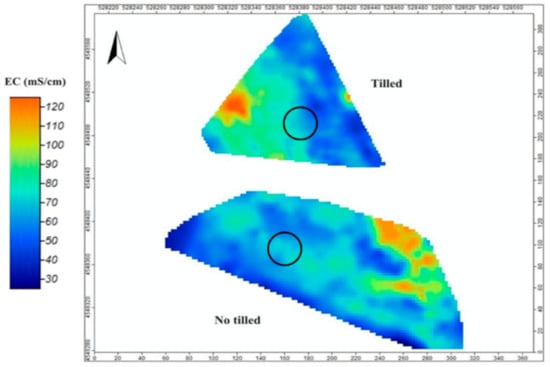Most of the area—excluding some spots—showed similar values of ECa between the range 60–80 ms cm−1. This homogeneous response of the soil profile cannot be directly reflected in a soil homogeneity, because the ECa is an integrated value that depends on many factors such as soil texture, layering, water content, and salinity—different combinations of which can produce similar results. Therefore, two profiles were open in zones showing the same value of ECa, respectively in the T and No-T field (black circles in the Figure 3), on the base of this first hypothesis on homogeneity.