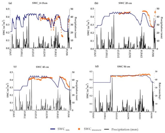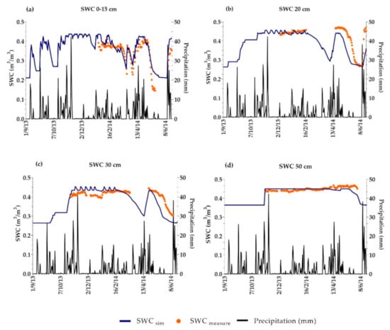 The calibration methodology followed a trial-and-error procedure to minimize, with an iterative process, the error propagation in the simulated processes, as described in [50]. The trial-and-error procedure consisted, first, of finding the soil hydraulic parameters in the T and No-T management treatments for the different soil depths, until the variation of the differences in SWC sim—SWC field became negligible with few deviations from one iteration to the successive. This calibration of hydraulic properties was required for field applications to consider the well-known deviation between laboratory-measured and field-measured hydraulic properties [51,52,53].