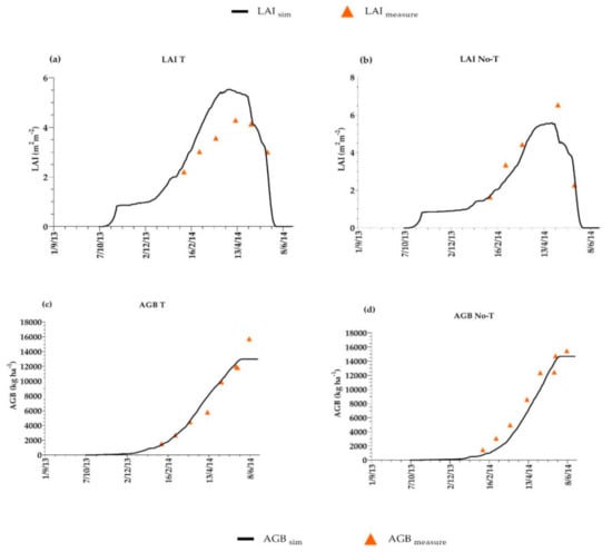 Secondly, the same method was developed for the crop phenological stages and crop parameters in the T and No-T treatments, until low estimation errors were obtained, with negligible differences in successive iterations for the phenological dates, LAI, and AGB field data. Therefore, the same values of the crop calibrated parameters were used in the T and No-T treatments.