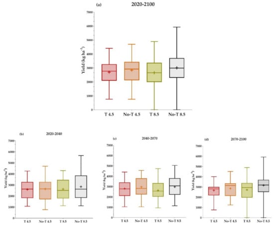Simulations depicted slightly higher yield variability in the No-T compared to the T treatment in each of the timeframes analyzed, although the variability experienced in the No-T management becomes narrower with time. This finding is consistent with the results reported in Bhari et al. (2019) [3], who predicted higher yield instability, and, at the same time, higher yield increase in wheat systems cultivated with CA practices than the ones with T, which presented more stability of yields, but a yield decrease over time.