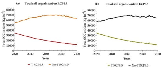 Therefore, the T system is not a sustainable management system, judging by the evolution of the SOC content and N leaching in the future period, while on the other hand, using the No-T management will enhance the SOC accumulation and prevent N losses. In this way, the No-T system with residues on the soil in durum wheat will constitute a proper management method to lower the N leaching and to enhance the content of SOC. These characteristics enhance to sequestrate atmospheric CO2 emissions, improve soil fertility, and soil water-holding capacity, and thus, as observed previously, will increase crop yield [7,28,59].