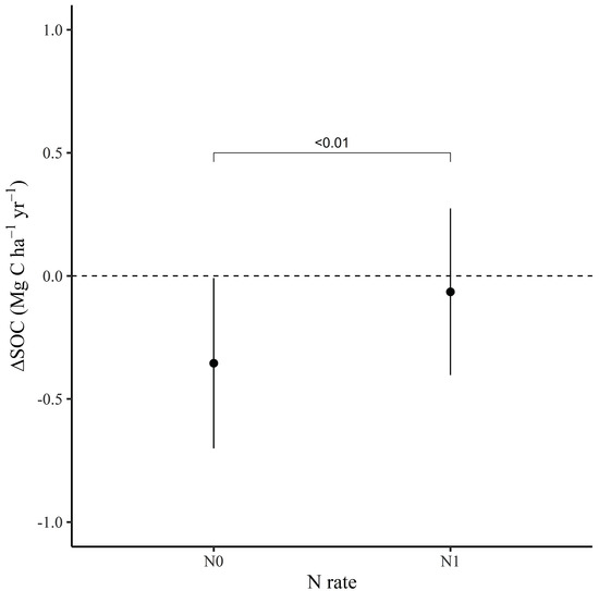 The SOC stocks were significantly affected only by the N rates over time across CS (N rate × Time, p < 0.01) (Table 3). Pooled over the CS, the differences in annual ΔSOC between the N rates were statistically significant (p < 0.01), with higher ΔSOC at N1 than at N0 (−0.1 and −0.4 Mg C ha−1 yr−1, respectively) (Figure 1).