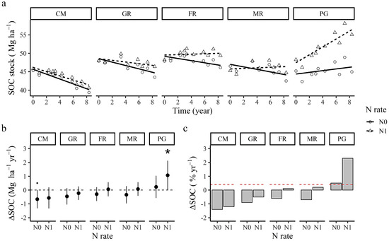 Differences in ΔSOC between the systems at the different N rates were observed (Figure 2a,b). The ΔSOC were negative at both N rates in CM (−0.7 and −0.6 Mg C ha−1 yr−1) and in GR (−0.5 and −0.2 Mg C ha−1 yr−1). In FR and MR, the ΔSOC were negative at N0 and positive at N1 (−0.3 and 0.1 Mg C ha−1 yr−1), respectively. In PG, the ΔSOC were positive at both N rates (0.2 and 1.1 Mg C ha−1 yr−1). Differences in ΔSOC between the N rates followed the order CM < GR < FR = MR < PG. While different tendencies were observed, only the ΔSOC of the PG at N1 statistically differed from zero (p < 0.05). In relative terms, only the PG reached ΔSOC slightly above 0.4% at N0 (0.5%) and considerably higher at N1 (2.3%), whereas for the crop rotations both FR and MR reached half of the target value at N1 (0.2%) during the measured period (Figure 2c).