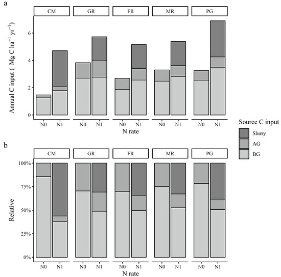 (a) Annual soil C inputs (Mg C ha−1 yr−1) and (b) relative inputs derived from cattle slurry (Slurry Cin), from aboveground (AG Cin), and belowground residues (BG Cin) for the different cropping systems and N fertilization rates, estimated for the period 2011–2018. CM: continuous silage maize, GR: grain rotation, FR: forage rotation, MR: mixed rotation, PG: permanent grassland, N0: unfertilized, N1: fertilized using cattle slurry at a rate of 240 kg N ha−1 in non-leguminous crops.