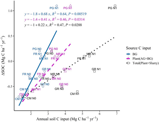 Relationship between annual soil C inputs from belowground (BG Cin), plant (AG Cin + BG Cin), and total (Plant Cin + Slurry Cin) with annual SOC changes (ΔSOC), for the different cropping systems (CS) and N rates in the topsoil layer (0–30 cm) in the period 2010–2018. CM: continuous silage maize, GR: grain rotation, FR: forage rotation, MR: mixed rotation, PG: permanent grassland, N0: unfertilized, N1: fertilized using cattle slurry at a rate of 240 kg N ha−1 in non-leguminous crops.