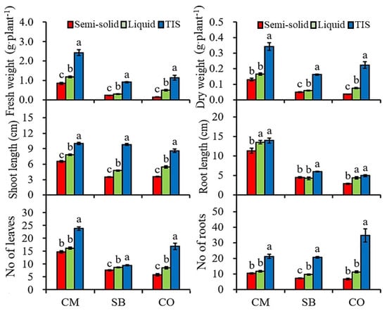 Fresh weigh, shoot length, and leaf number of chrysanthemum (CM), strawberry (SB), and Cnidium officinale (CO) plants after 4 weeks in semi-solid, liquid, and TIS cultures. Bars with different letters differ significantly from each other by Duncan’s multiple-range test (DMRT; p ≤ 0.05).