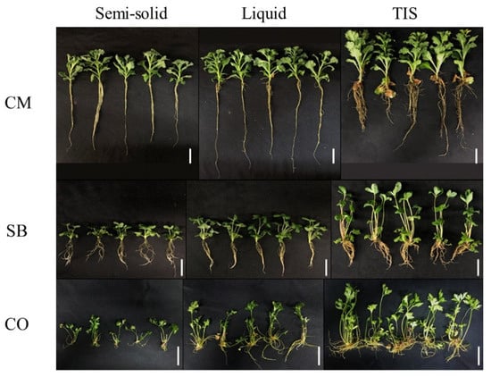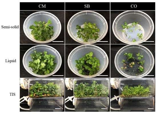 Chrysanthemum (CM), strawberry (SB), and Cnidium officinale (CO) plants after 4 weeks in semi-solid liquid and TIS cultures. Scale bars = 5 cm.
