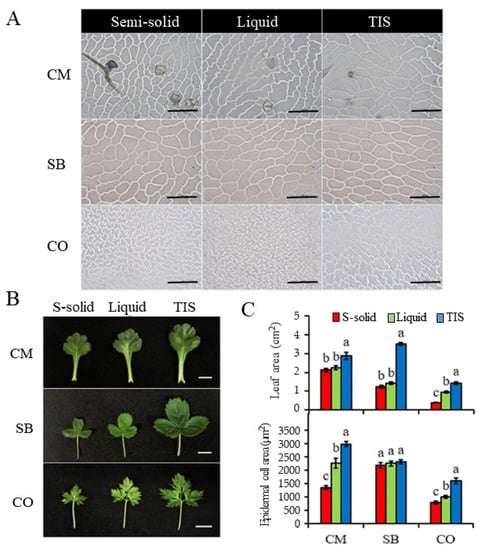 Cytological analysis of chrysanthemum (CM); strawberry (SB); and Cnidium officinale (CO) plants grown in semi-solid, liquid, and TIS cultures. (A) Cytological observation of adaxial leaf surface of CM, SB, and CO plants grown in semi-solid, liquid, and TIS cultures (scale bar = 100 µm). (B) Morphological observation of leaves of CM, SB, and CO plants grown in different culture systems (scale bar = 1 cm). (C) Leaf area and epidermal cell area of CM, SB, and CO plants grown in semi-solid (S-solid), liquid, and TIS cultures. Bars with different letters differ significantly from each other by Duncan’s multiple-range test (DMRT; p ≤ 0.05).