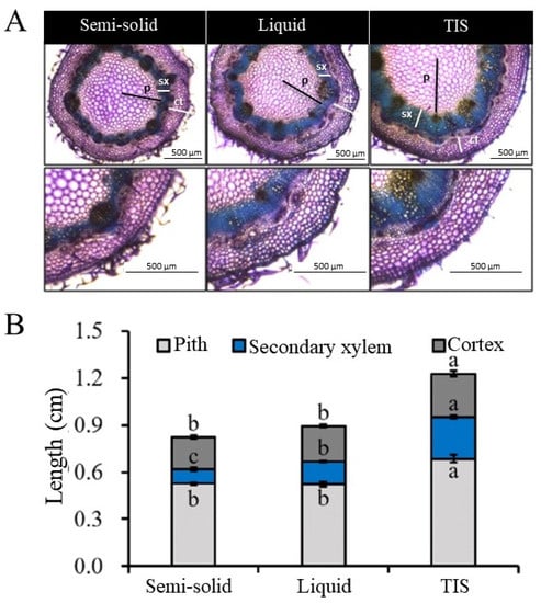 Histological analysis of chrysanthemum plants grown using semi-solid, liquid, and TIS cultures. (A) Histological observation of chrysanthemum stems in semi-solid, liquid and TIS cultures (p: pith, sx: secondary xylem, ct: cortex). (B) Stem diameter of chrysanthemum plants in semi-solid, liquid and TIS cultures. Different letters differ significantly from each other by Duncan’s multiple-range test (DMRT; p ≤ 0.05).