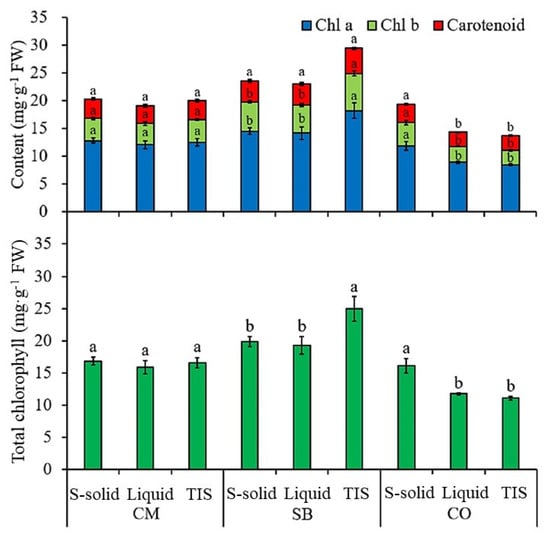 Chlorophyll a, Chlorophyll b, and Carotenoid content of in vitro grown chrysanthemum (CM), strawberry (SB) and Cnidium officinale (CO) plants grown in semi-solid (S-solid), liquid, and TIS cultures. Bars with different letters differ significantly from each other by Duncan’s multiple-range test (DMRT; p ≤ 0.05).