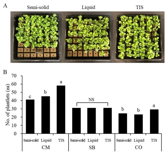 Acclimatization of in vitro grown chrysanthemum (CM), strawberry (SB), and Cnidium officinale (CO) plants in TIS and semi-solid and liquid cultures. (A) Acclimatized chrysanthemum plants after 4 weeks harvested from semi-solid, liquid, and TIS cultures. (B) Number of acclimatized plants after acclimatization of semi-solid, liquid, and TIS cultures. NS: no significance. Different letters differ significantly from each other by Duncan’s multiple-range test (DMRT; p ≤ 0.05).