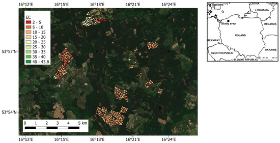 Evaluation of available nutrients content such as potassium, magnesium, and phosphorus as well soil pH is very important in crop production because it allows for the optimization of soil fertilization and liming. Soil sampling and chemical analysis demand expenses which are higher if such soil sampling is conducted frequently and at high spatial density. Accurate evaluation of soil physico-chemical properties is very important in site-specific crop management, where variable-rate fertilization is applied. Delineation of management zones allows obtaining more accurate soil maps because soil properties within such zones are more homogenous. One composite soil sample represents each management zone. Areas of such management zones should be homogenous according to the most important agronomical soil properties such as soil texture, content of soil organic carbon, pH, and content of the most important nutrients such as potassium, phosphorus, and magnesium. Delineation of management zones can be based on proximal sensing (e.g., evaluation of electrical conductivity—EC) or remote-sensing data (e.g., satellite-derived spectral indices). One of the most common spectral indices used for delineation of management zones is NDVI (Normalized Difference Vegetation Index) from satellite sensors of high or medium spatial resolutions such as, e.g., Sentinel-2 [1,2], Landsat 8 [3,4], or PlanetScope [5]. The main reason why NDVI is used for such a purpose is its strong positive relationship with grain yield, which was observed in many studies at different spatial scale on various crops including cereals, including wheat and barley [6,7,8,9,10], and rapeseed [10,11,12]. Usually, NDVI is more strongly correlated with yield in later growth stages, i.e., near to harvest, however some studies proved strong relationships in early crop stages which are observed in winter crops such as winter cereals [7,8]. In early crop stages, it is usually not a good indicator of yield potential. NDVI is not only correlated with grain yield, but also with soil properties, which are important in crop management, such as soil texture and content of nutrients [13,14,15,16]. Because of that, NDVI is not only an index which is related to current crop status, but it is a more complex measure of soil agronomical conditions. Another variable which is commonly used for the delineation of management zones is apparent electrical conductivity (EC) using the proximal sensing method [17,18,19,20,21,22,23]. Electrical conductivity is strongly correlated with soil moisture, which in turn is related to soil texture. Higher EC usually means higher content of clay and lower content of sand, which was proved in various studies [24,25,26]. The strength of the relationships between EC and soil fractions ranges from weak to very strong (coefficient of determination near 1). EC depends on soil moisture and soil temperature, and because of that it is variable in time. However, the relative differences for various areas within the field are quite stable in subsequent measurements for the same field. More comprehensive approaches used for the delineation of management zones use a set of variables which characterize both yield potential and soil agronomical properties, e.g., various satellite spectral indices (besides those of NDVI, e.g., RVI, SAVI, MSAVI, GEMI, IPVI) and electrical conductivity of soil [27,28,29,30]. The delineation of management zones is especially important in optimized stratified soil sampling and later in variable-rate fertilization [31,32,33,34]. Proper delineation of management zones allows obtaining more accurate soil maps which can be used for recommendation of fertilizer doses and the application of variable-rate fertilization.