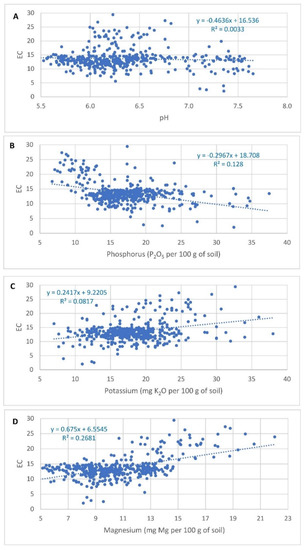 Correlation coefficients between NDVI and EC with content of potassium and magnesium for barley for all fields together (Table 7) proved similar relationships to those observed for winter wheat. Positive correlations were observed between NDVI and EC with potassium and magnesium in 2018 and 2019; negative or very weak correlations were observed between NDVI and EC with pH and phosphorus content in soil. The correlations for all barley fields and average content of K and Mg for years 2017–2019 were stronger between potassium with NDVI (r = 0.63 for year 2019 and 0.23 for 2018 and very weak in 2017, r = 0.05) than between magnesium with NDVI (r = 0.40 in 2019, 0.11 in 2018 and negative in 2017, r = −0.35). Correlations between EC with K and Mg were positive, respectively r = 0.18 and 0.40. Correlations between NDVI and EC with pH and P were rather weak. For all barley fields and average content P in soil for years 2017–2019, the strongest correlation was with NDVI in 2019 (r = −0.33), and for years 2017 and 2018 they were weaker (−0.18 and −0.16 respectively). The correlations for content of nutrients for individual years were quite consistent with these, which were observed for average content of nutrients, i.e., correlations between NDVI and EC with K and Mg were positive and significant, while between NDVI and EC with pH and P were negative or very weak. Stronger correlations were observed for NDVI in comparison with correlations with EC, but only for the year 2019, while for the other two years they were weaker.