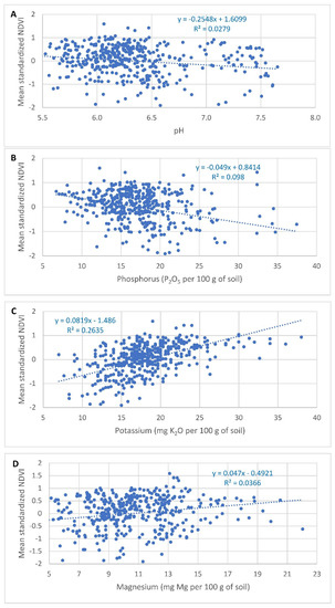 In this study, negative significant relationships were observed between pH and phosphorus content in soil with NDVI and EC. Especially strong relationships were observed for winter wheat. The results were opposite to the expected because they mean that the higher pH and phosphorus content, the lower NDVI, and as a result the lower the grain yield. However, we should notice that negative correlations between potassium and magnesium content with phosphorus content were observed. Moreover, high phosphorus content in soil was related with high pH. High pH can cause lower ability for uptake by plants of phosphorus because of phosphorus fixation by calcium (precipitation of Ca phosphate minerals) [49,50,51]. Negative correlations between content of phosphorus content in soil with yields of various crops, including cereals, were found in some previous studies [27,52]. Similar results, i.e., a negative relation between NDVI with content of phosphorus in soil and pH, were observed in the study of Serrano et al. [27]. The highest phosphorus content (more than 50 mg P per kg) and the highest pH (5.6) were observed for the within-field management zone where NDVI as well yield potential was the lowest in comparison with medium- and high-potential management zones (P in the range of 20–30 mg per kg and pH in the range of 5.4–5.5). Another study [16] which presented relationships between soil properties with NDVI and grain yield of cereals (wheat and barley) proved a positive correlation between content of potassium with NDVI and grain yield (positive values of regression coefficients in multivariate model), but the relationship with content of phosphorus was not consistent, relatively weak, but in some cases positive and in some cases negative. A study on the delineation of management zones for a cotton field in Eastern China [53] proved negative relations between content of potassium as well pH with NDVI and cotton yield. The lowest pH (7.56) and content of available potassium (96 mg per kg) was observed for the management zone with the highest productivity, while the highest values (pH = 7.90 and 14 mg K per kg) were observed for the zone with the lowest productivity. Other factors such as content of nitrogen and organic matter were positively correlated with grain yield and NDVI. The results prove that potassium and phosphorus are not crucial for obtaining high yields. We should notice that usage of NDVI have some limitations including lack of availability of satellite images because of cloud cover [54], atmospheric effects, sensor factors, the saturation phenomenon [55], or other problems such as the existence of weeds which affect the value of the spectral index [56]. These problems should be avoided, e.g., by using multi-temporal satellite data.