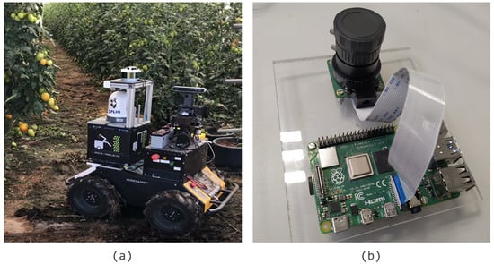 AgRob v16 (a) and the Raspberry Pi High Quality camera (b) used for image collection.