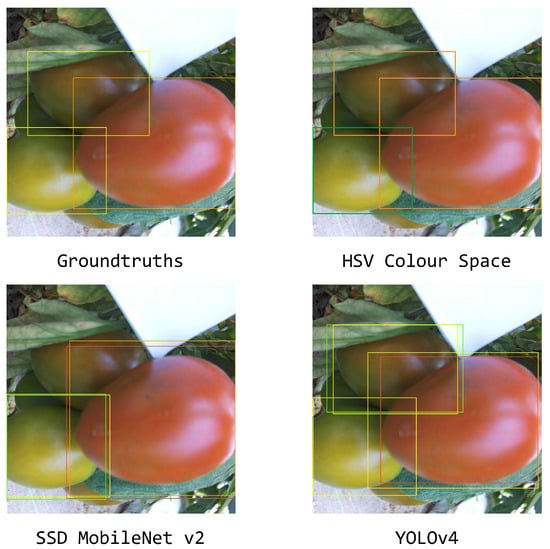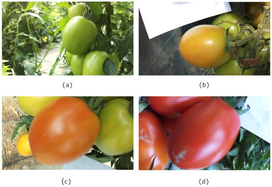 The general focus of the ML field is to predict an outcome using the available data. The prediction task can be called a “detection problem” when the outcome represents a single class. If the outcome represents different classes, it means a “classification problem” []. This study aims to detect and classify tomatoes using two one-stage object detection frameworks (SSD and YOLO). When it comes to classification, to differentiate the fruits according to their ripeness stage, four classes were defined based on the USDA colour chart for fresh tomatoes [], as presented in Figure 2.